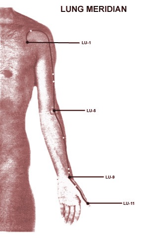 This meridian starts below the clavicle and travels along the outside of the biceps muscle. It continues along the outside of the forearm and ends on the outside part of the thumb.
